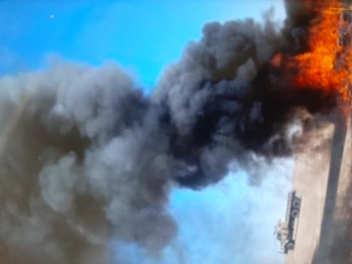 The scene depicts a large, active fire generating a dense, black smoke plume that ascends prominently against a clear blue sky