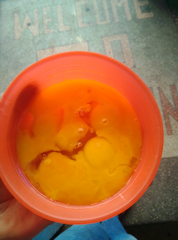 - "The image presents a close-up, top-down view of an orange, circular plastic bowl containing multiple cracked eggs" by FM-c9RUg1, licensed under CC BY 4.0