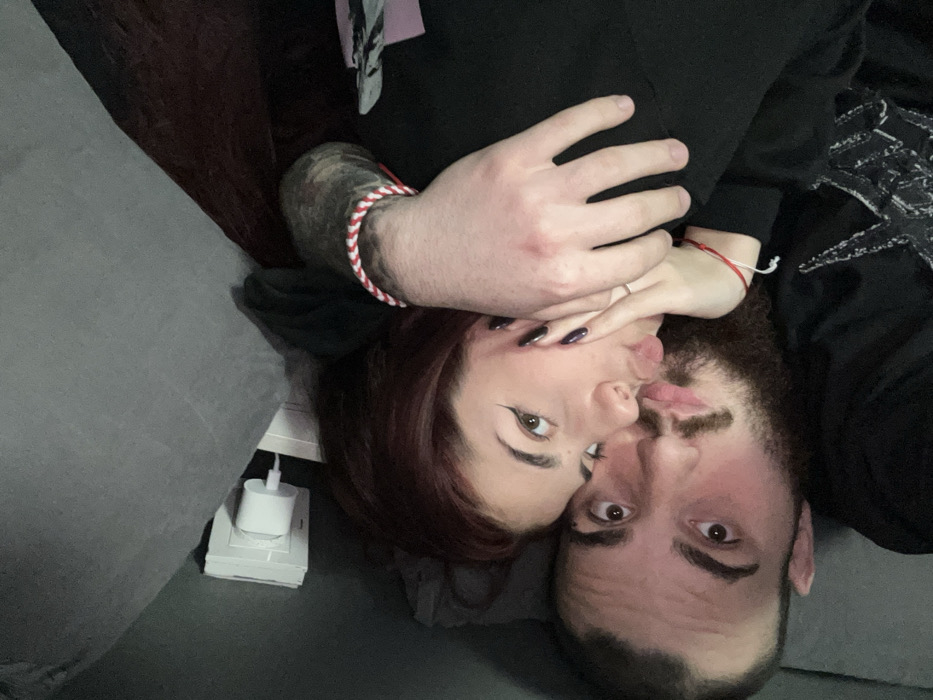 The image displays a close-up, slightly tilted portrait of two individuals, a male and a female, in an indoor setting in Yambol, Bulgaria. The male, positioned on the left, has a dark beard and mustache, with wide-open eyes looking forward. He wears a dark shirt with a partial white graphic design. His right arm, adorned with a red and white braided Martenitsa bracelet, rests around the female, and his forearm displays dark patterns, possibly tattoos. The female is in the foreground on the right, her head resting near the male's. She has dark red hair, winged eyeliner, and her lips are pursed. Her eyes are directed forward. Her left hand, featuring dark nail polish, touches her own cheek. She wears a silver ring on her left ring finger and a thin red string bracelet on her left wrist. Her left arm is wrapped around the male. The background features a dark grey upholstered surface on the left and top. A white electrical outlet with a white charger adapter plugged in is visible in the upper left corner. A dark brown textured surface is present on the right side of the frame. The scene is dimly lit.