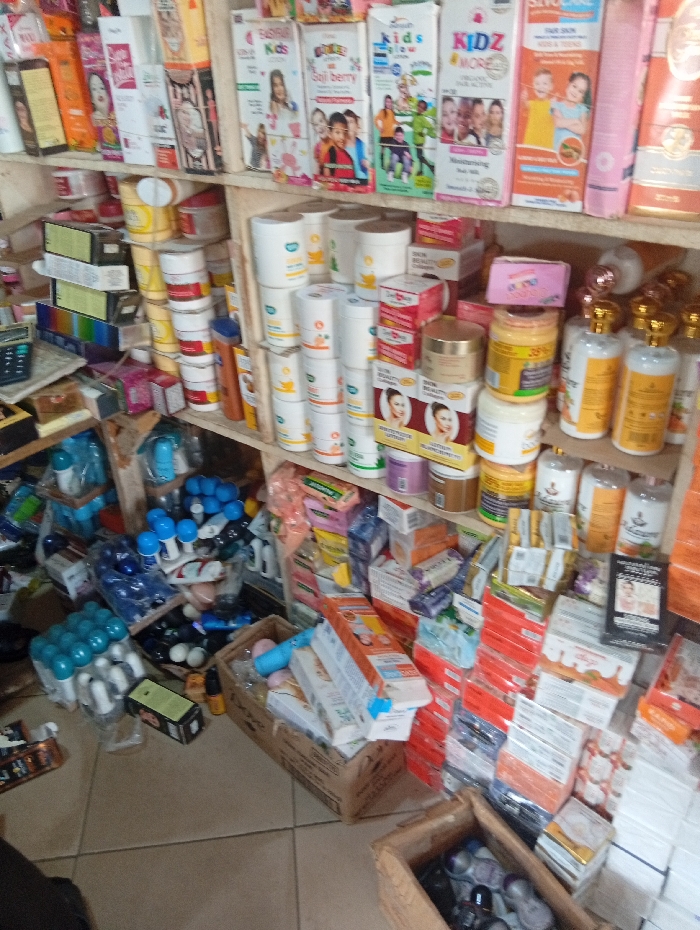 - "This image depicts a cluttered retail interior in Jos, Nigeria, likely a pharmacy or cosmetic store, viewed from a slightly elevated perspective towards the back wall" by FM-t0Iet2, licensed under CC BY 4.0