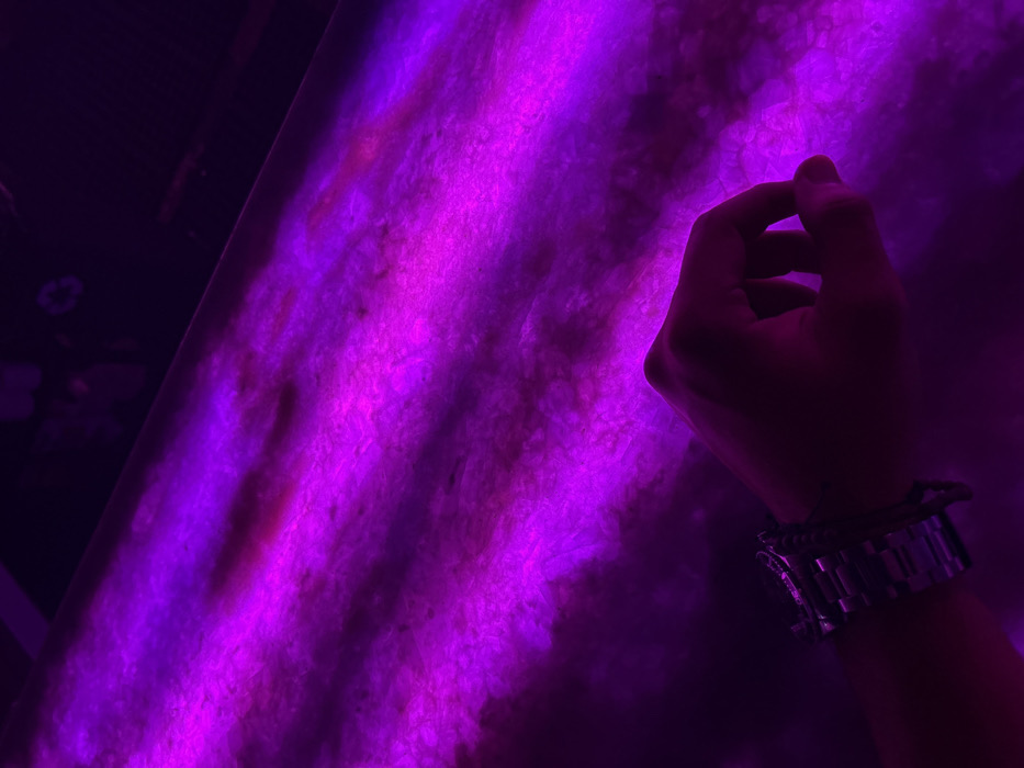 A human left hand, partially clenched and wearing a metallic link-bracelet wristwatch on the wrist, extends from the lower-left foreground of the image. The hand is silhouetted against a brightly illuminated background of textured material, characterized by intense magenta and purple artificial light that creates irregular, cloud-like patterns. Darker, undefined patches are present within these luminous patterns. The upper right portion of the image features a dark, indistinct area separated by a diagonal line from the illuminated background. The environment is dominated by this vibrant artificial lighting. The specific location within Mérida, Mexico, cannot be determined from the visual information provided in the image.