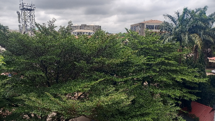 This image depicts an elevated view of a city landscape in Abuja, Nigeria, under an overcast sky. The foreground and midground are dominated by a dense canopy of lush green trees. In the background, a tall, multi-tiered metal telecommunications tower with numerous antennas is visible on the left. To its right, several multi-story buildings with light-colored facades are partially obscured by the foliage. Further to the right, a distinct concrete building with horizontal window features is visible, adjacent to a tall palm tree. Below the palm tree, a small section of a red-tiled roof and a portion of a white vehicle are discernible. No individuals or specific actions are visible within the scene.