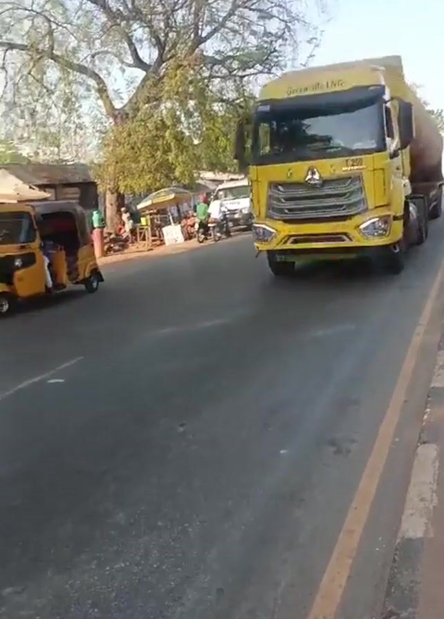 yellow tractor-trailer driving on a paved road. The truck has a large, cylindrical, tan-colored tank in tow. The side of the truck has a logo with the letters "GG" in the center. The trailer has six wheels and appears rusty. The video is taken from the side of the road, next to a curb. In the background, there are small shops and people on motorcycles. There is also a white van and a white pickup truck parked on the side of the road. A small, yellow three-wheeled vehicle is also visible near the shops. A large tree with bare branches is in the background.