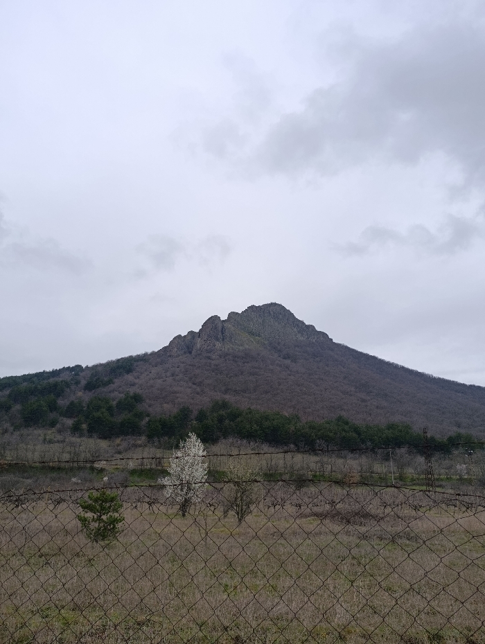 The scene depicts a rural landscape in Shiroko pole, Bulgaria, under an overcast sky. A rusty chain-link fence occupies the foreground, separating the viewer from a field of dry, light-brown grass. Beyond the fence, a small coniferous tree stands to the left, and a prominent deciduous tree in full white bloom is centrally positioned. Further back, a field of dormant trees or vines with bare branches stretches horizontally, backed by a line of dark green evergreen trees at the base of a mountain. Faint utility infrastructure, possibly power lines or poles, is discernible in the midground. The background is dominated by a large mountain with bare, dark-brown deciduous forest covering its slopes, culminating in a rugged, rocky peak with some green vegetation. The sky is a uniform light grey with visible cloud formations. No individuals or specific activities are observed within the frame.