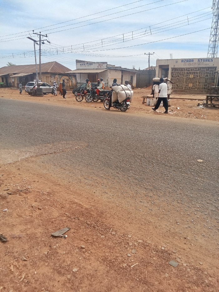 This image depicts a bustling street scene in Rido, Nigeria, under an overcast sky. The foreground shows a dirt shoulder with scattered debris, leading to an asphalt road surface. On the right side, a dirt path parallels the road, extending towards a series of single-story commercial buildings. Prominently, a building on the far right is identified as "AZADA STORES," featuring a large grey facade with a rolled-down metal gate. To its left, another building also displays "AZADA STORES" and "AZAD PHARM." signage. Multiple utility poles with overhead power lines traverse the scene, with a tall communication tower visible in the far distance on the right. Approximately 10-15 individuals are present. On the far right, a male figure wearing a white shirt and dark trousers walks left-to-right, carrying a large white sack on his head. Nearby, a group of people congregates near wooden benches. In the center-right, a black motorcycle is parked on the dirt shoulder, heavily loaded with several large white sacks secured to its rear. Behind it, another dark motorcycle and a red motorcycle are parked, with individuals standing nearby. Further left, a silver SUV is parked on the dirt shoulder next to a stack of tires, with individuals interacting around it. Another dark sedan is partially visible behind the motorcycles. The overall environment suggests a commercial and communal area with mixed vehicle and pedestrian traffic.