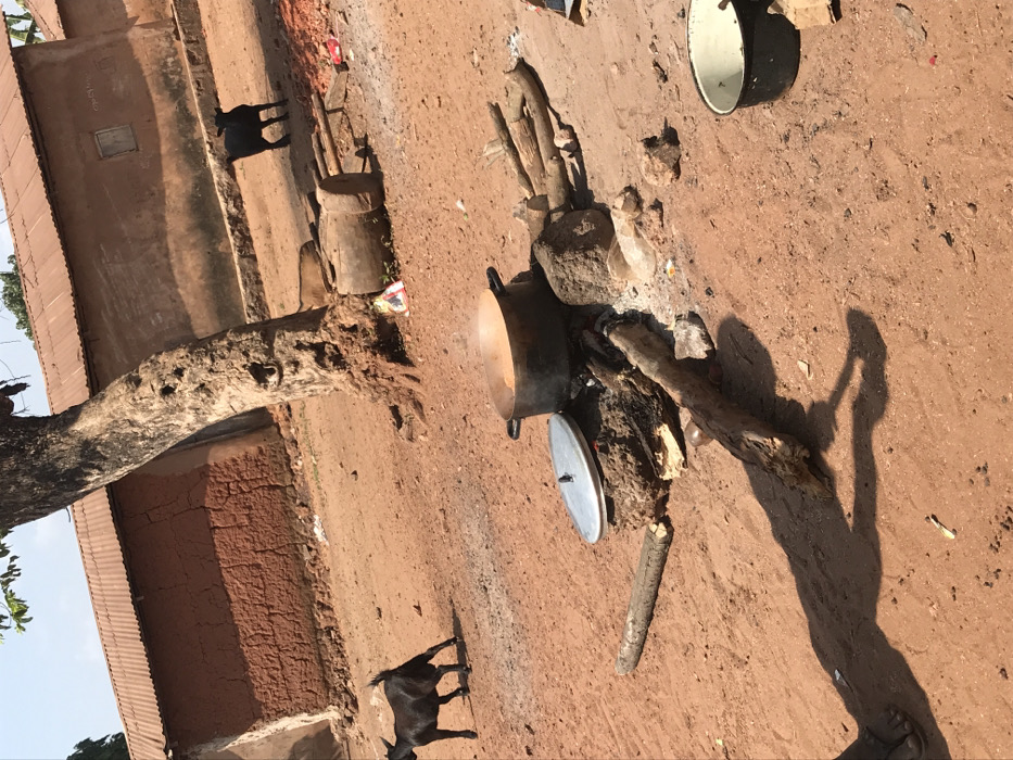 The image captures an outdoor scene in Ogodo, Nigeria, dominated by reddish-brown unpaved earth under bright sunlight