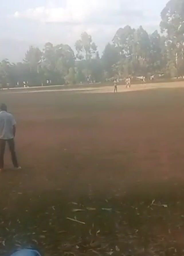 grassy field with trees in the background and people scattered across the field. One man in a light-colored shirt and dark pants stands facing the field, with his hands in his pockets. Someone wearing a blue hat is partially visible in the bottom left corner of the frame. The overall visibility is somewhat hazy. The people on the field appear to be walking, but their actions are not clear due to the distance and haze.