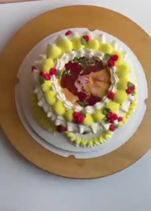 The camera pans around a round, two-tiered cake sitting on a round, wooden surface. The cake is decorated with yellow and white frosting, and red rosettes. In the center of the cake is a picture of Belle from "Beauty and the Beast". The background behind the cake is peach and white.