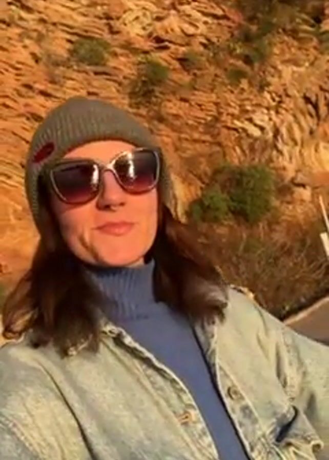 person in a gray beanie, sunglasses, a blue turtleneck, and a denim jacket, standing outdoors. The person is holding the camera and slowly panning around. Initially, a rocky hillside is visible in the background. Then, the camera pans to reveal a seascape with the sun setting over the water. The sunlight reflects off the ocean surface.