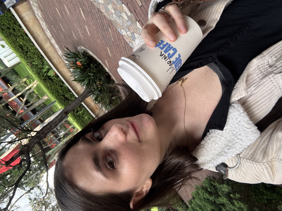 A young adult female with dark brown hair, light skin, and visible freckles is centered, looking directly at the camera with a slight smile. She wears a black long-sleeved, buttoned top under a light-colored, possibly beige, corduroy jacket with a white sherpa-style collar. A gold-colored necklace is visible on her chest. Her left hand holds a white disposable coffee cup with a white plastic lid. The cup is labeled "MARINA VERDE CAFÉ" in blue text, with "Clasico" (likely 'Clásico') handwritten in black ink above it. A silver-colored ring is present on her left ring finger. The background features a paved area constructed from reddish-brown bricks and lighter-colored stones. Behind her, a raised planter contains green foliage and orange flowers. Further back, a manicured green lawn, hedges, and trees are visible, with modern architectural structures featuring red and dark-colored elements in the distance. The scene is located at the Universidad Anáhuac México Norte campus in Huixquilucan, State of Mexico, within the Mexico City metropolitan area, Mexico.