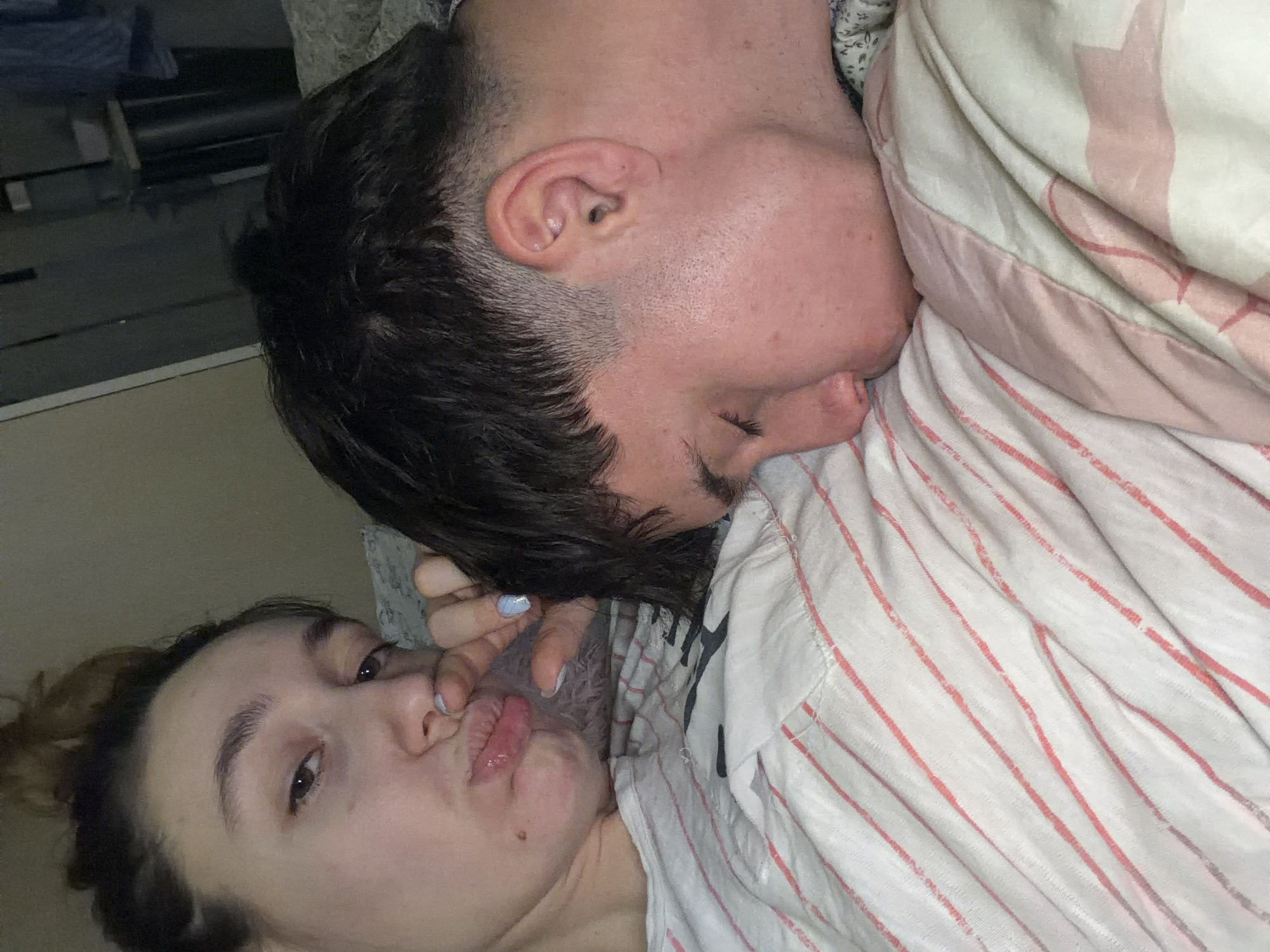 Two individuals are lying down indoors, likely in a bed. One individual, with short dark hair and an undercut, is positioned closer to the top of the frame. Their face is turned slightly towards the other individual. The other individual, with hair pulled back in a bun, is closer to the bottom of the frame, looking up towards the camera. They appear to be interacting, possibly kissing. The location is undetermined. The image contains bedding with a red and white striped pattern. The location in the city of Sofia, Bulgaria, cannot be determined from the information provided in the image.