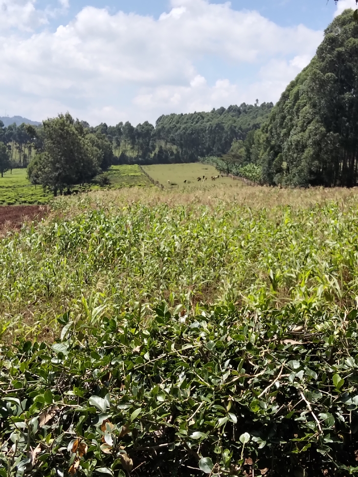 The scene is a rural agricultural landscape in Nyansiongo ward, Kenya, under a partly cloudy daytime sky. The immediate foreground is dominated by a dense growth of dark green foliage, consistent with tea bushes. Directly behind this, a field of green maize stalks extends across the midground. To the left of the maize field, a patch of reddish-brown tilled soil is visible. Beyond the maize, a green pasture occupies the middle distance, delimited by a discernible wooden fence line. Within this pasture, approximately eight cattle are observed grazing. The background consists of rolling hills densely covered with trees, predominantly tall, slender eucalyptus, with other varied tree species also present on the left side. No human subjects are visible.