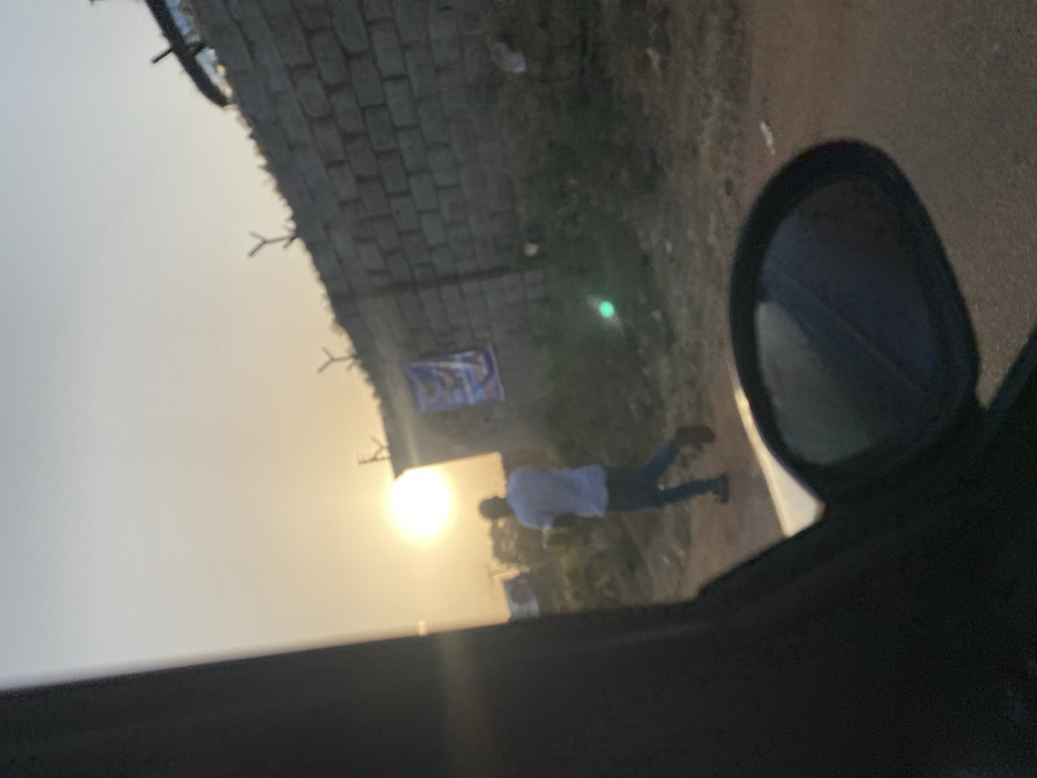 A roadside scene viewed from inside a car. A man in a white shirt and jeans walks along the side of the road as the sun is low on the horizon. A brick wall lines the side of the road and a sign is hanging on the wall. A side mirror is visible in the right side of the frame.