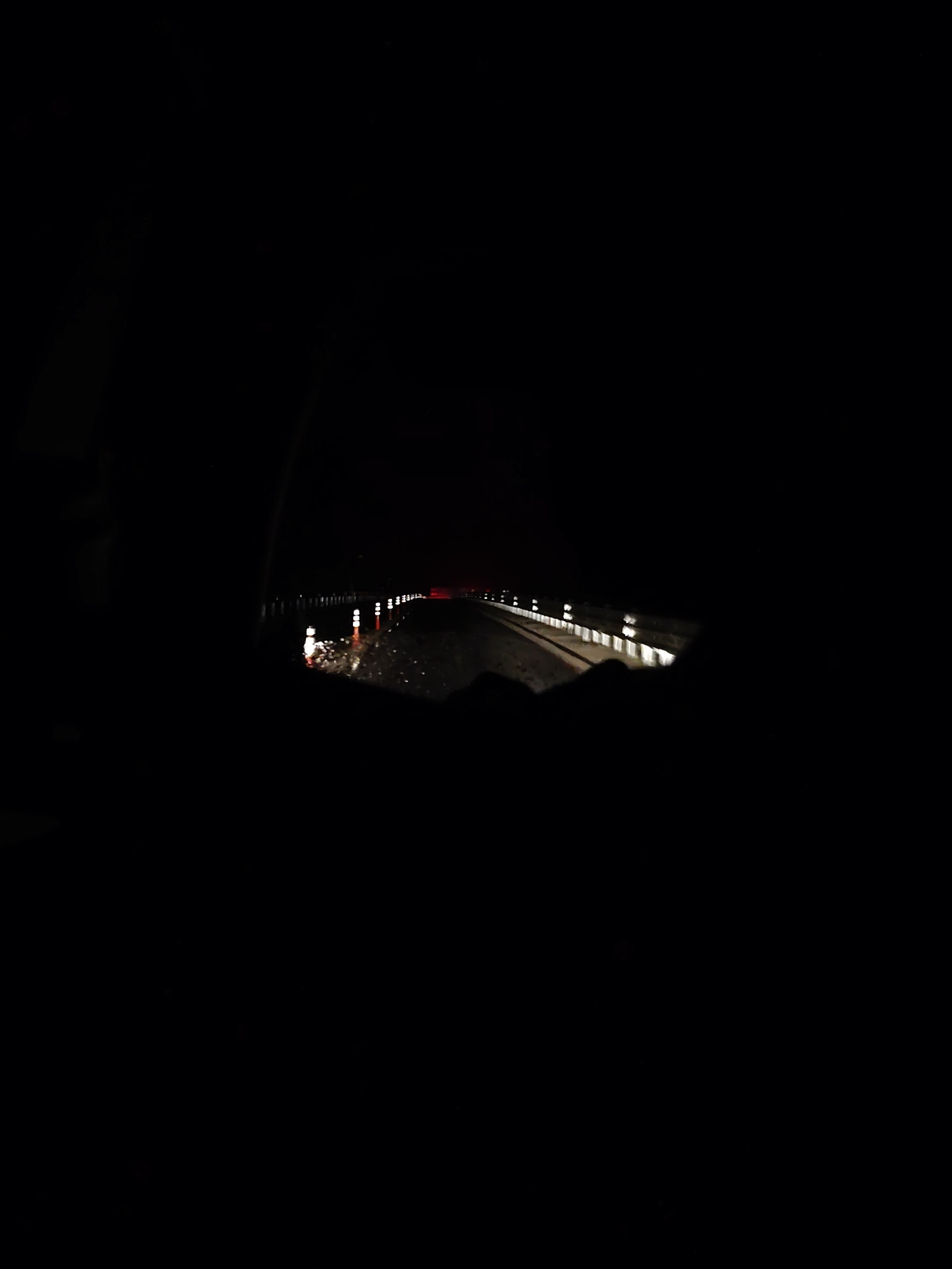The image depicts a nighttime scene observed from inside a vehicle, located in Rashkovo, Bulgaria. The environment is characterized by deep darkness, with artificial light sources illuminating a wet road surface. The primary subject is a paved road extending into the distance. On the left side of the road, approximately five vertical objects, consistent with road cones or bollards, are visible. These objects are white with reflective orange bands and are reflecting light, suggesting they are part of road-marking or safety infrastructure. The road surface itself is wet, creating elongated reflections of these light sources and other distant lights. On the right side of the road, a barrier or guardrail is visible, also featuring multiple reflective markers or lights that recede into the distance. Farther along the road, a single, distinct red light is present, positioned centrally, which may indicate a distant vehicle's taillight or a signal. The immediate foreground and the left periphery of the image are dominated by dark, out-of-focus shapes, consistent with the interior elements of a vehicle (e.g., dashboard, window pillar) from which the photograph was captured. No individuals or specific actions are discernible within the frame. The scene's illumination relies solely on these scattered artificial light points against the pervasive darkness.