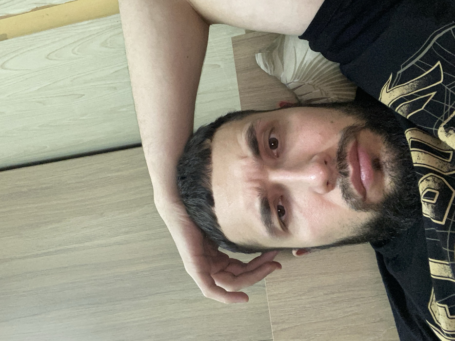 A bearded man lies on a light brown floor, his head resting on his arm. He gazes directly at the camera. He is wearing a black shirt with yellow graphic designs. A pillow is visible near his head. The man's expression appears serious.