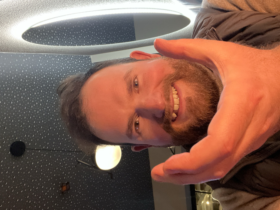 A man with a beard and short brown hair is smiling broadly, holding his hand up near the camera
