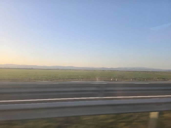 The image displays a panoramic view of a rural landscape, likely captured from a moving vehicle in the vicinity of Загорци, Bulgaria. The foreground features a multi-lane asphalt road with two distinct white lane markings, partially obscured by a horizontal, gray metal guardrail. Beyond the road, a vast, flat expanse of cultivated green fields dominates the midground, extending towards a distant horizon. Scattered light-colored posts are visible along the far edge of the road, bordering the fields. The background consists of a low mountain range, appearing hazy and muted blue against the sky. The sky transitions from a pale yellow-orange near the horizon to a clear light blue overhead, suggesting either early morning or late afternoon conditions. No individuals, animals, or explicit actions are depicted. The scene is static, depicting an open, agrarian environment under natural light.