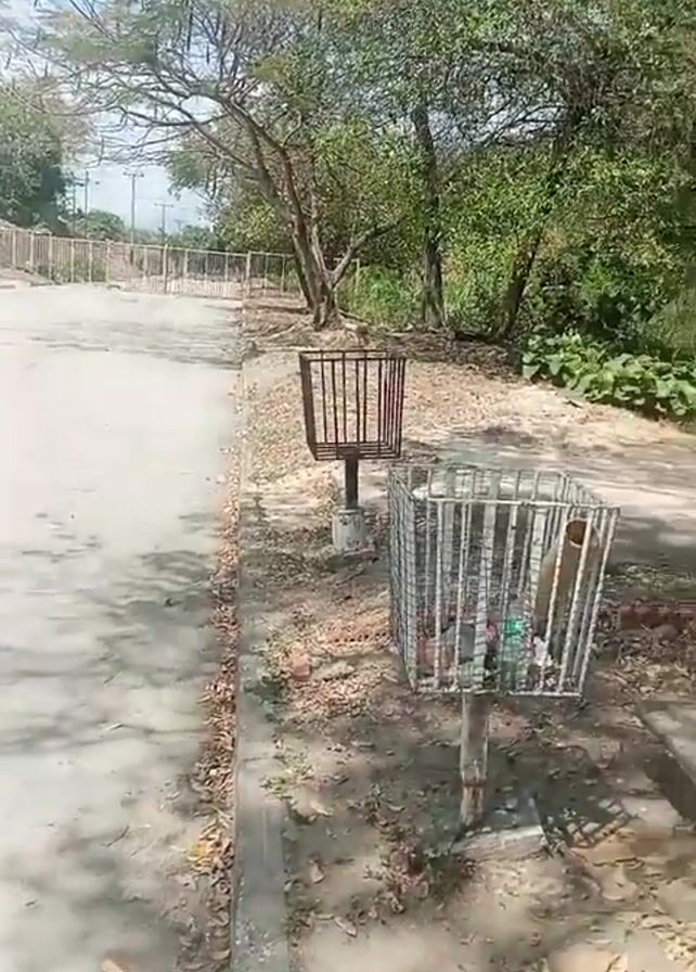 The camera pans slowly across a park-like setting on a sunny day. The ground is mostly concrete, with some dirt and fallen leaves along the edges. There are two metal trash cans mounted on posts, one of which is partially full of trash. Beyond the concrete is an area of dense vegetation, including trees and tall, dry grass. A metal fence is visible in the distance. There are no people visible in the video. The camera movement is the only action.