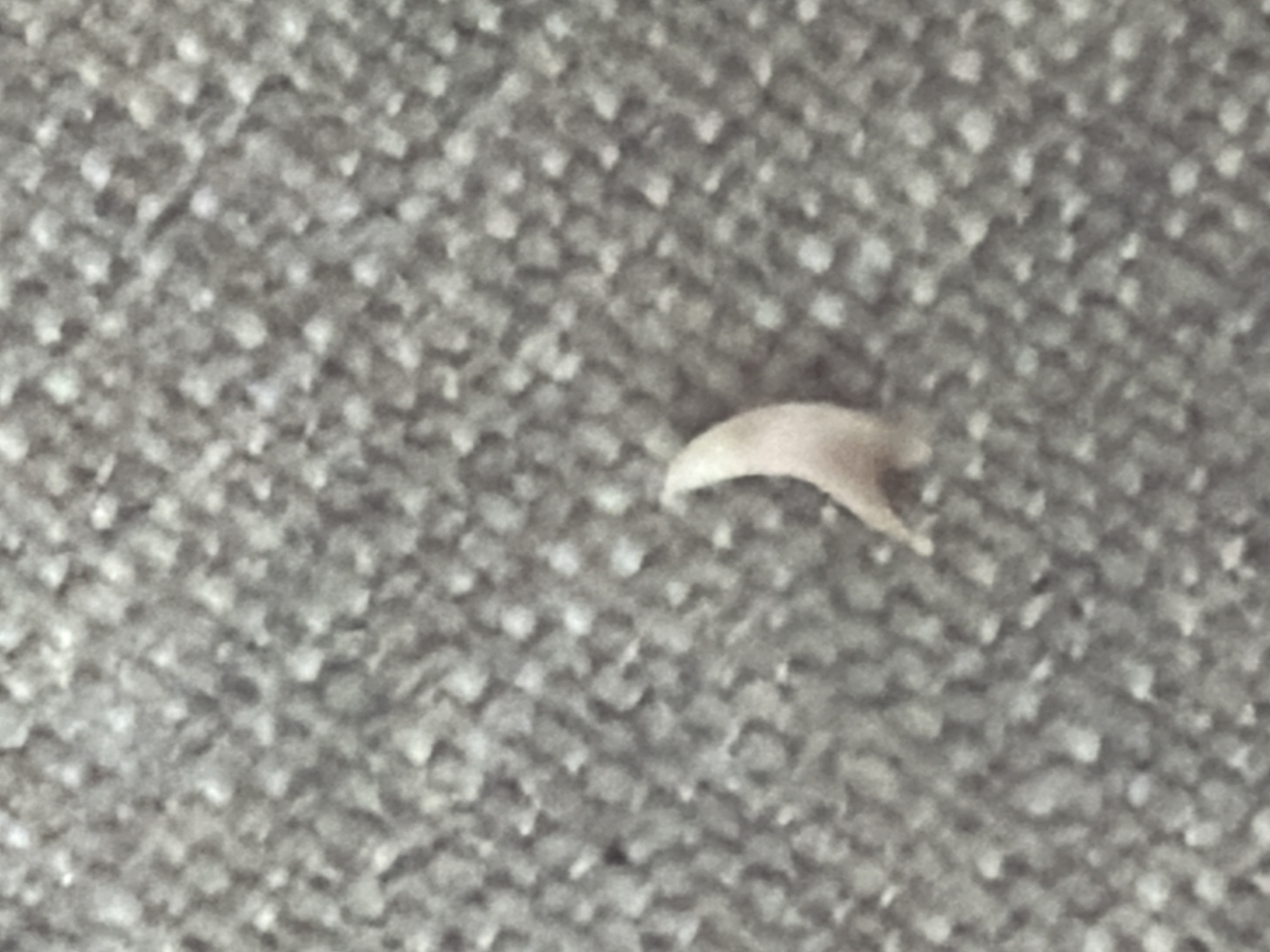 The scene, located in Boreti, Montenegro, depicts a single, small, light beige object resting on a gray, flecked textile surface. The object is curved, tapering to a pointed tip at one end and broadening slightly at the base, resembling a detached claw or a large nail fragment. Its surface appears smooth. The background textile displays a dense, consistent pattern of varying gray tones, consistent with carpet or robust fabric. No individuals, actions, or interactions are visible.
