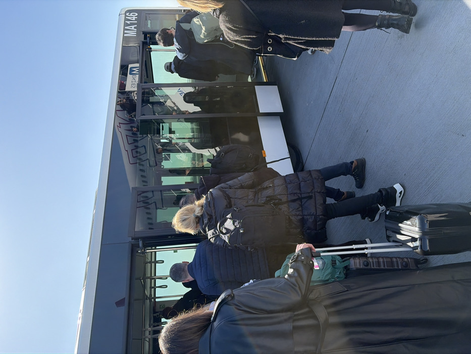 The image depicts an outdoor airport tarmac scene in Otopeni, Romania, specifically at Henri Coandă International Airport. A group of approximately ten to fifteen individuals are queuing to board a white and dark-colored airport shuttle bus, identified by the visible number "MA 146" and the reflected "Menzies Aviation" logo on its side. The bus doors are open, and passengers are actively entering. Most individuals are seen from behind or the side, dressed in winter coats or puffer jackets, and several are managing rolling suitcases and backpacks. The ground is a grey concrete surface, and the sky is clear and bright blue, indicating daytime conditions.