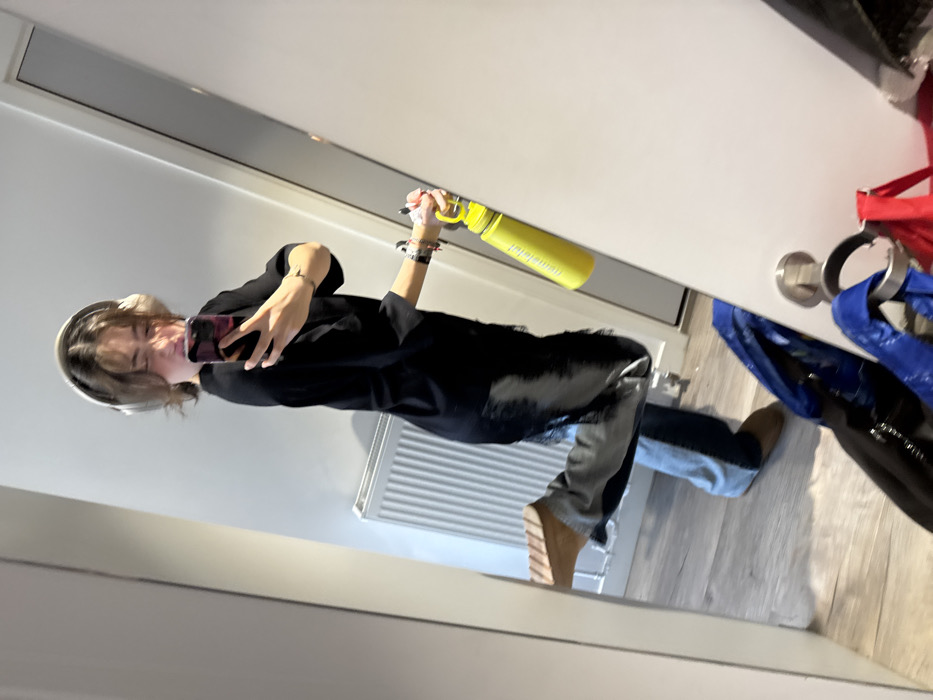 A person is depicted taking a mirror selfie indoors in Hull, United Kingdom. The individual, appearing to be a young adult with short brown hair, is wearing light-colored over-ear headphones, a black short-sleeved top, and two-tone jeans with light blue and dark blue/black sections. They wear light brown boots or shoes on their feet, with the left leg bent upwards. A yellow water bottle is held in their left hand, while a black smartphone with a purple/pink reflection on the screen is held in their right hand, pointed towards the mirror. Their facial expression is a grimace or playful frown. The mirror reflects a room with light wooden flooring and a white wall featuring a white radiator. Various items are visible on the floor near the base of the mirror, including a blue IKEA bag, a red bag, and a black bag, all appearing to be storage or shopping bags. The lighting appears even, suggesting an indoor setting.