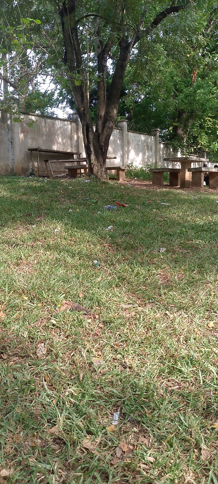 The image depicts an outdoor, grassy area situated in Tudor ward, Kenya, under daylight conditions. The foreground consists of irregularly mown green and brown grass interspersed with fallen leaves and scattered litter, including plastic wrappers of various colors (red, blue, white) and crumpled paper. In the midground, a large, multi-trunked tree with dark, furrowed bark and green foliage stands prominently slightly left of center. To the left of this tree, adjacent to a perimeter wall, is a weathered wooden picnic table with attached benches. To the right of the central tree, two concrete picnic table sets with integrated benches are visible; one is fully exposed, while the other is partially obscured to its right. The background is dominated by a light-colored, aged concrete perimeter wall, approximately 2.5 meters high, displaying signs of weathering and periodic vertical pilasters. Portions of the wall's top edge feature what appears to be barbed or razor wire. Beyond the wall, additional green foliage and trees are visible, indicating further vegetation. No individuals are present in the scene.