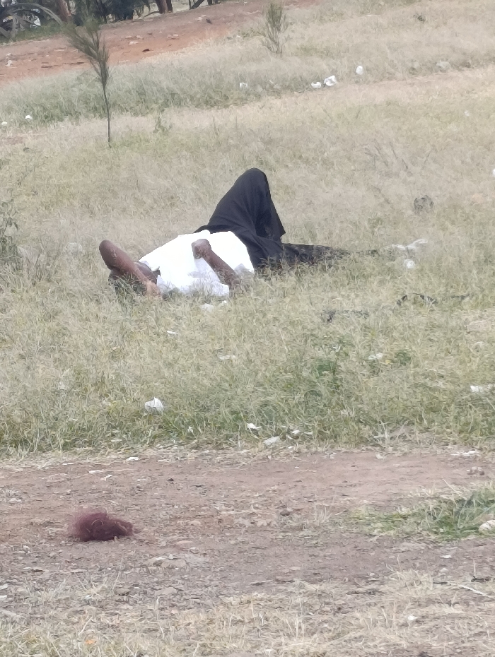 In the city of Matungulu west ward, Kenya, an outdoor scene depicts a single individual lying prone on their back in an expanse of dry, light green and yellowish grass. The person is dressed in a white top and a black garment that covers their lower body and appears to be pulled over their head, obscuring their face. Their arms are bent, with one hand visible near the chest area and the other arm extending to the right. One bare foot or lower leg is visible on the left side of the frame. The individual is positioned diagonally across the midground, with their head to the left and feet to the right. In the immediate foreground, a reddish-brown, indistinct clump of material rests on a patch of bare dirt. The ground transitions from a dirt path in the foreground to the grassy area where the individual lies. Scattered white debris, possibly plastic bags or paper, is visible within the grass around the person. The background features more sparse grass, small trees or shrubs, and a dirt path or road. The overall environment appears to be an undeveloped or semi-urban outdoor area under natural daylight.
