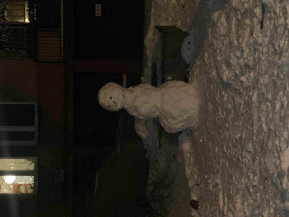 The image displays a nighttime, snow-covered residential scene in Warsaw, Poland. A three-tiered snowman, approximately 1.2 meters tall, stands centrally. It possesses two dark circular eyes, a small orange-brown cylindrical nose, and a faint, curved mouth. Two short, thick snow arms extend laterally from its midsection. The snowman is positioned in front of a dark, low-lying rectangular concrete or stone planter, which is partially covered in snow. The ground is uniformly covered with an uneven layer of white snow. In the lower left foreground, a dark, reddish-brown object, possibly debris, is partially embedded in the snow. To the left of the snowman, leafless branches of a shrub or small tree are visible. In the background, a multi-story building with a dark facade is illuminated by ambient artificial light. On the upper floor, a window on the left is brightly lit from within, showing a large circular light source and smaller star-shaped decorations. An adjacent window to its right is dark. To the far right, a balcony with dark railings is adorned with a string of small, illuminated lights. Below the upper floor, the building features several dark, recessed ground-level entrances, possibly garages. A white sign with black Polish text, partially obscured but legible as "SZANUJ SWOJEGO SASIADA NIE PARKOWAĆ" (Respect Your Neighbor Do Not Park), is affixed to the building below the illuminated window. Another white sign with red text, "P ZAKAZ" (Forbidden), is visible on the right side of the building, above a dark entrance. No individuals are present in the scene.
