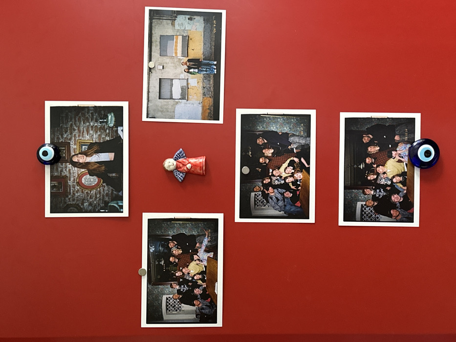 Five rectangular photographs with white borders are displayed on a vibrant red wall, along with one ceramic figurine. **Arrangement:** * The top photograph, centered, is held by a dark blue "evil eye" magnet. * Below and to the left of the top photograph is a second photograph, held by a silver pushpin. * To the right of the second photograph, and slightly above its bottom edge, is a third photograph. * Between the second and third photographs, centered vertically, is a small ceramic angel figurine. * Below the third photograph, and aligned approximately with the center of the wall, is a fourth photograph. * The bottommost photograph, centered, is held by another dark blue "evil eye" magnet. A third "evil eye" magnet is visible at the very bottom edge of this photograph. **Photographs (from top to bottom, left to right):** 1. **Top Photograph:** A medium shot of a female subject with long dark hair, wearing a dark blazer over a light shirt. She stands indoors against a brick wall decorated with multiple framed pictures and a dark glass bottle. 2. **Middle-Left Photograph:** A group of approximately 10-12 individuals, predominantly young adults, are gathered around a wooden table in an indoor setting. The background features patterned wallpaper. Subjects are smiling and appear to be posing for the camera. A date "24.12.14" is visible in the lower right corner. 3. **Middle-Right Photograph:** A full-body shot of two subjects, a man and a woman, standing side-by-side outdoors against a weathered, multi-toned wall of a building with two dark, rectangular window openings. The man wears jeans and a dark jacket; the woman wears jeans and a green top. A date "24.9.29" is visible in the lower right corner. 4. **Lower-Middle Photograph:** A group of approximately 10-12 individuals, similar to those in the Middle-Left photograph, gathered around a wooden table in an indoor setting with patterned wallpaper. Subjects are smiling and posing. A date "24.12.14" is visible in the lower right corner. 5. **Bottom Photograph:** A third group of approximately 10-12 individuals, similar to the previous group photos, gathered around a wooden table in an indoor setting with patterned wallpaper. Subjects are smiling and posing. A date "24.12.14" is visible in the lower right corner. **Figurine:** A small, red-bodied ceramic angel figurine with white trim, blue wings, and a smiling face is centrally located on the wall. The entire scene is a personal display of photographs and decorative items, likely from a residence in the city of Moscow, Russia.