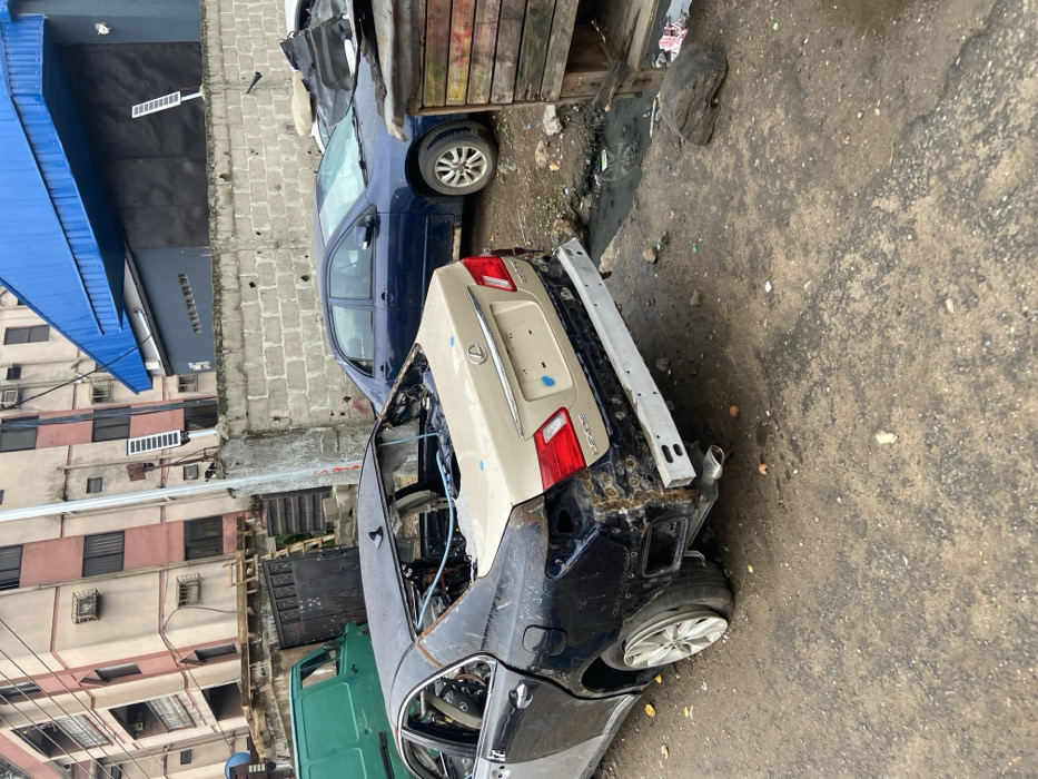 The scene depicts an outdoor salvage or repair area in Alaiyabiagba, Nigeria. In the foreground, a severely stripped and damaged dark-colored Lexus ES sedan is parked on a dirt ground. The vehicle's rear section, including the trunk lid, is tan/beige, while the sides are predominantly dark. The rear bumper is missing, revealing a bare metallic mounting beam. Significant rust and exposed metal are visible on the rear quarter panels. The rear window, windshield, and roof interior are absent, exposing internal wiring and structure. The front left tire is flat. Behind the Lexus, a dark blue sedan, likely a Toyota Corolla, is parked. To the far left, a green van is partially visible. The background features a textured concrete block wall. Behind this wall, a multi-story building with light peach-colored walls and darker trim around windows and balconies is visible on the left. To the right of the multi-story building, another structure with a distinctive blue corrugated metal roof stands. A wooden stall with multi-colored panels is positioned on the far right, next to a visible open drainage ditch containing dark, stagnant water and debris. The ground is uneven dirt, scattered with miscellaneous trash and small objects. A solar-powered light fixture is mounted on a pole near the concrete wall. No individuals are present or engaged in any discernible actions.