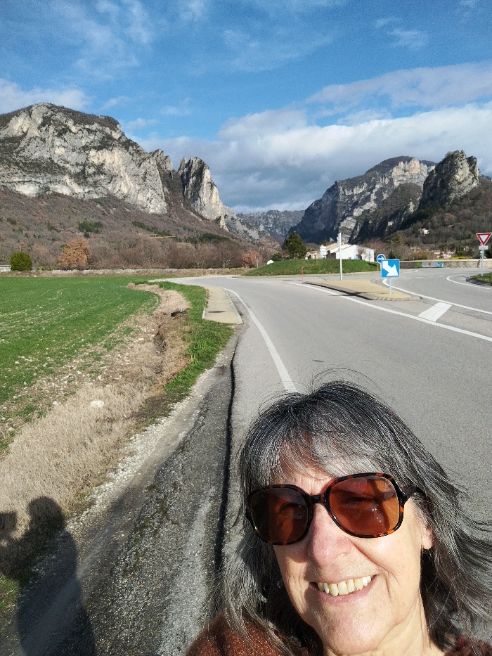 The image depicts an outdoor scene in Francillon-sur-Roubion, France, featuring an adult female in the foreground taking a selfie. The woman occupies the lower right portion of the frame, smiling with visible teeth, and wearing large, dark brown tortoiseshell sunglasses. Her gray hair is visible around her face, and a shadow on the lower left confirms a selfie being taken by a person holding a device. The background shows a paved asphalt road curving to the right from the immediate foreground, with a solid white line marking its edge. A green grassy field, possibly agricultural, runs along the left side of the road, separated by a narrow dirt verge. In the middle distance, the road forms a roundabout or intersection marked by a red "Yield" sign and a blue "mandatory direction right" sign. Beyond the road and fields, prominent rocky mountains with steep, rugged faces dominate the horizon, particularly on the left and center. The mountainsides are sparsely covered with deciduous trees, appearing bare, alongside some evergreen vegetation. A few white buildings are visible at the base of the mountains near the road. The sky is partially cloudy with blue patches, and strong sunlight is evident, casting shadows.