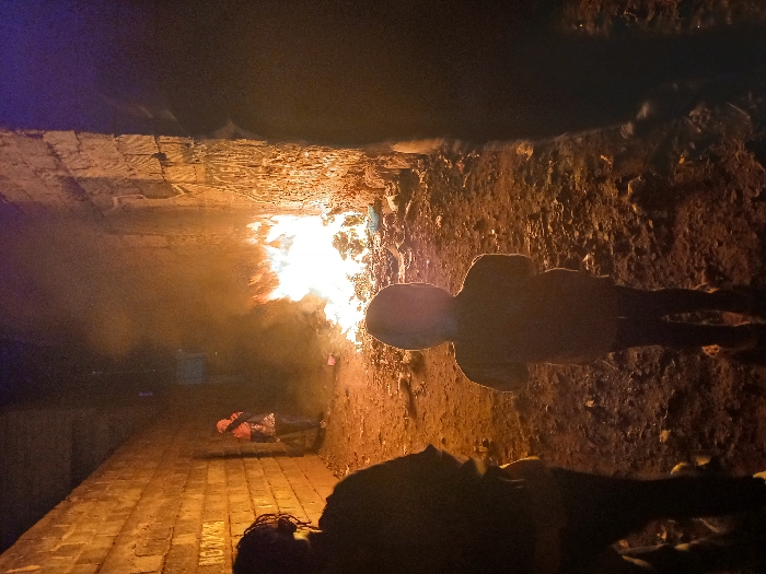 A fire burns brightly in the darkness. Two figures stand in the foreground. Another person, dressed in orange, lies prone along a walkway in the background. A brick wall is visible on the left with "NO PARKING" written on it. The right side shows a dirt wall with rocks. It appears to be at night.