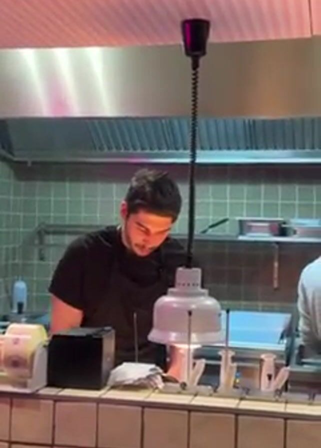 In a medium shot, a man in a black shirt and apron stands behind a tiled counter in what appears to be a commercial kitchen