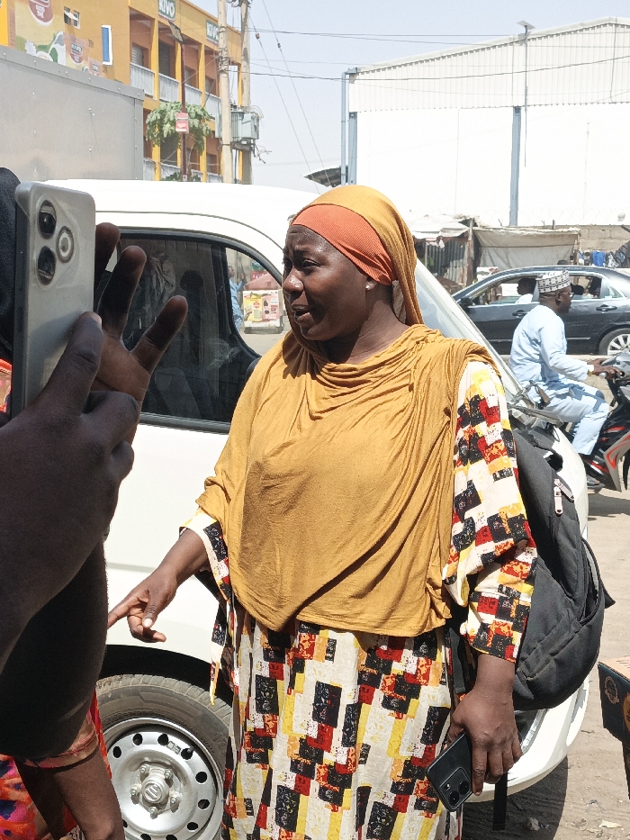 A daytime street scene in Fagge C, Nigeria, features a central female figure interacting with another individual