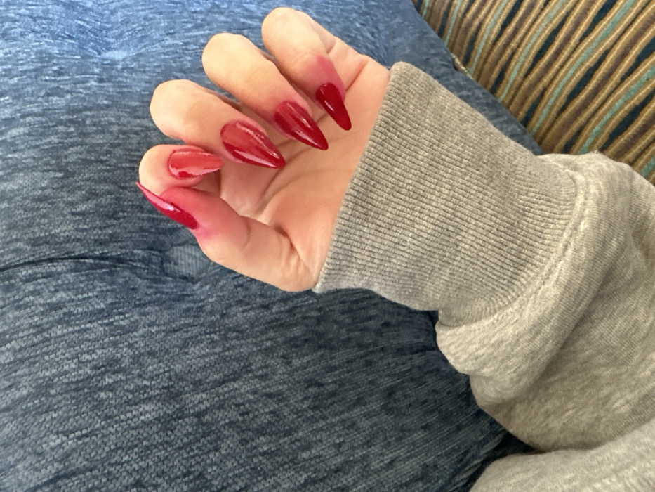 A close-up, downward-angle shot reveals a person's left hand and forearm against a textured background. The hand displays long, pointed, glossy red artificial nails. Red polish or residue is visible on the skin around the cuticles of the thumb, index, and middle fingers. The forearm is covered by a light grey long-sleeved garment with a ribbed cuff. The immediate background consists of a dark blue, textured fabric, likely upholstery, and a diagonally striped fabric in shades of brown, tan, and light blue to the lower right. The scene is located in Unknown, Unknown.
