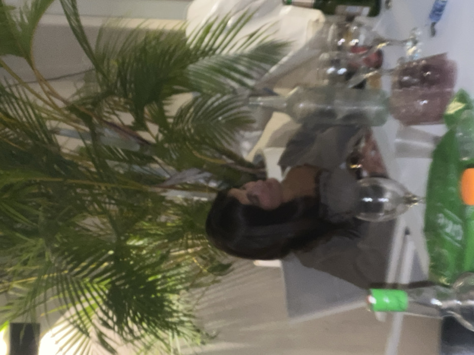 The image depicts an evening outdoor or semi-outdoor gathering in Rishon LeZion, Israel. A female individual with dark hair is seated at a light-colored table, looking towards her left. She wears a dark-colored top, possibly with patterned trim, and a lighter long-sleeved garment over it. Behind her is a large potted palm-like plant with numerous fronds, positioned in front of a light-colored wall or structure. The table contains several objects: a glass bottle with a green cap, a taller clear glass bottle, multiple empty wine glasses, a partially visible green plastic bag, a small orange cap, a purple-tinted glass container with contents, a small white plastic cup, and a green bottle on the far right. The setting is illuminated by artificial light sources.
