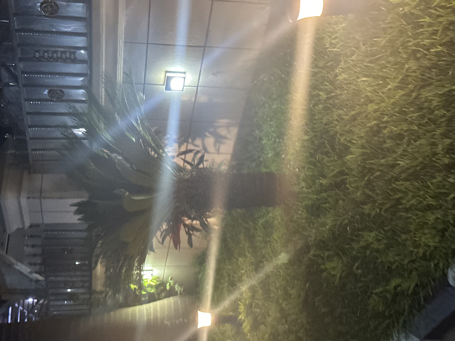 The image displays a tropical plant with a thick trunk and sprawling green fronds next to a lush lawn at night. A building facade is seen in the background, exhibiting both modern and ornate architectural elements. Soft light emanates from fixtures on the building and possibly garden lights along the edge, creating streaks across the shot. The image has a strong diagonal composition.