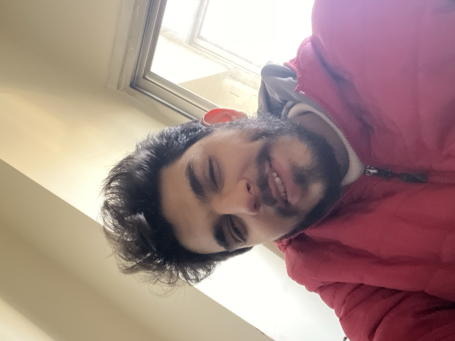 The scene depicts a male individual in an indoor setting within Rukn ad-Din Municipality, Syria. The individual, a young adult with dark, voluminous hair, a full beard, and a mustache, is positioned in a close-up, head-and-shoulders portrait, suggesting a selfie. He is smiling, with visible teeth and a dimple on his right cheek. His left eye is partially closed, possibly winking or narrowed from the smile. He is wearing a red puffer jacket, partially unzipped, revealing a white turtleneck sweater underneath. A grey hooded garment or lining is visible around the neck area. The background consists of a light-colored wall on the upper left and a window frame with a bright, indistinct exterior view on the upper right. The lighting is bright and even.