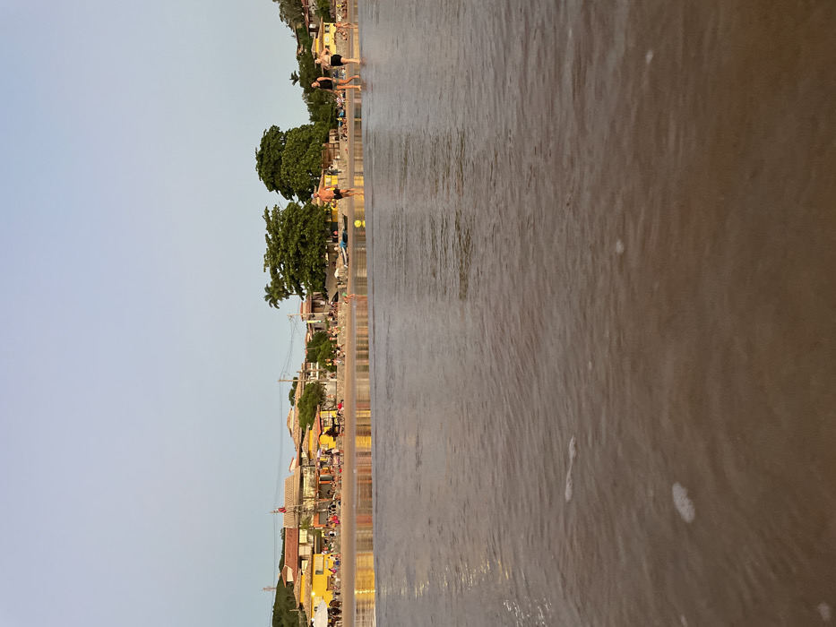 This image depicts a coastal scene in Armação dos Búzios, Brazil, observed from a low vantage point within the shallow, calm ocean water during late afternoon or early evening. The foreground is dominated by rippling, reflective brown-gold seawater, occupying the bottom half of the frame, with small patches of white foam. Beyond the water, a sandy beach stretches horizontally, populated by numerous individuals engaged in leisure activities. On the far left, a horse-drawn carriage is visible on the sand near buildings. Towards the center-left, a lifeguard stand with a red and white flag stands on the beach. Several people are seated at tables or on the sand under umbrellas. In the shallow water, a small child plays near a yellow ball. To the child's right, a man in dark swim trunks walks through the water, followed by two women also walking through the water. Various small boats, possibly kayaks or canoes, are pulled onto the sand further to the right. The background features a vibrant line of low-rise buildings, predominantly yellow, orange, and white with red-tiled roofs, characteristic of coastal architecture. Lush green trees, including two large, prominent deciduous trees and some palm trees, are interspersed among the structures. Utility poles and power lines are visible above the buildings. Vegetated hills frame the town in the far background on both sides. The sky above is a clear, light blue, indicative of a mild, illuminated atmosphere.