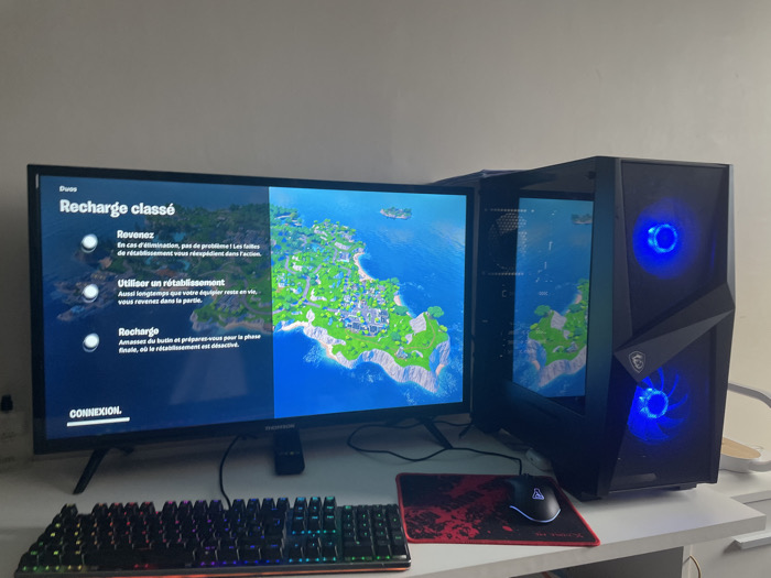 This image depicts an indoor gaming setup located in the city of Caen, France. The scene features a black Thomson flat-screen monitor displaying a video game with French text on the left panel detailing "Recharge classé" (Ranked Reload/Revive) options, and a stylized island map view on the right. To the right of the monitor is a black desktop gaming PC tower, identified as likely MSI by a visible logo, with two prominent blue LED-illuminated fans. In the foreground, resting on a white desk, are a black mechanical gaming keyboard with multi-color RGB backlighting, and a black gaming mouse with a white illuminated logo, positioned on a red and black patterned mouse pad. The background consists of a plain, light-colored wall. No people are visible. The computer system is powered on and actively displaying game content, suggesting it is in use or ready for use.
