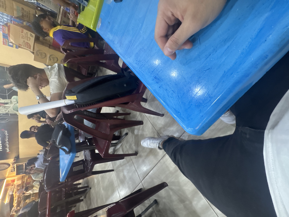 This image depicts an indoor scene within a casual eatery or cafe located in Rukn ad-Din Municipality, Syria. The foreground features the lower body of an individual, dressed in black trousers and white sneakers, with their right hand resting on a light blue rectangular plastic table. The establishment is furnished with multiple brightly colored plastic tables, predominantly blue, with one visible light green table, and numerous dark red/maroon plastic chairs. The floor is covered with light-toned square tiles. In the midground, several individuals are seated. One person with dark, curly hair, wearing a light-colored collared shirt, is seated at a blue table, with their right hand near their head. A black backpack, from which a white cylindrical tube protrudes vertically, is placed on a chair next to them. Further to the right, another individual, wearing a purple and yellow striped tracksuit, is seated facing away from the viewer at a light green table. The background shows additional patrons seated at tables. A black shoulder bag rests on a blue table in the mid-left. A light-colored wall features a large poster with Arabic text and a visible "NESCAFÉ" brand logo. Stacks of cardboard boxes are piled against a wall on the right side of the room, suggesting storage or inventory. The overall scene indicates a busy, informal gathering space.