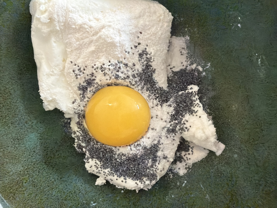 This image depicts a close-up, overhead view of ingredients within a dark green, textured bowl, presumed to be in Rostov-on-Don, Russia. The bowl contains a mound of white, granular, and slightly lumpy substance, consistent with a dairy product such as cottage cheese or ricotta, positioned predominantly on the right side. Centrally placed on this white substance is a single, intact, bright yellow egg yolk. Numerous small, dark grey to black granular seeds, consistent with poppy seeds, are scattered across the white substance, surrounding the egg yolk, and lightly visible on portions of the exposed green bowl surface. No individuals are present. The scene indicates the initial stages of food preparation.