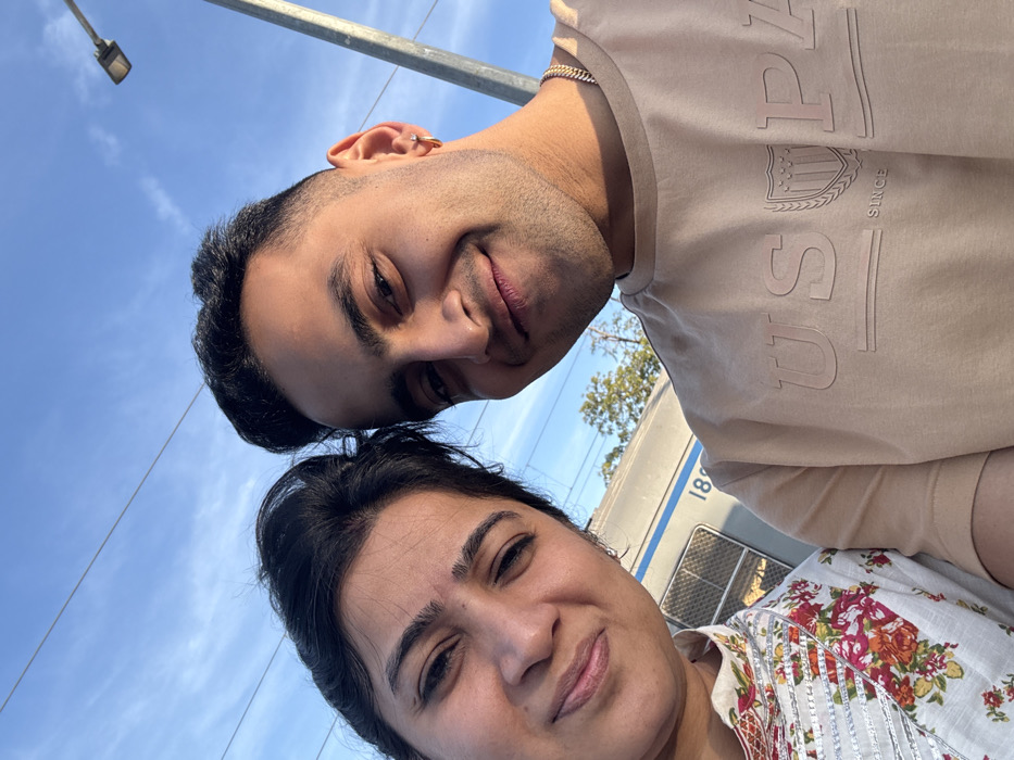A close-up image depicts two individuals, one female and one male, positioned closely as if for a selfie. Both are smiling and looking towards the camera. The female is on the left, with dark hair and a partially visible bindi on her forehead; she wears a white top featuring floral patterns and silver embroidered accents. The male is on the right, with short dark hair, light facial stubble, a small gold hoop earring in his left ear, and a gold chain around his neck; he wears a light brown/beige t-shirt with an embossed "USPA" logo including a crest and "SINCE" text. The background shows a blue sky with faint clouds. Behind the female and between the two individuals is a light-colored train car, featuring a blue stripe and the partial number "183." A vertical metal pole, possibly a street light pole, is visible behind the male on the right, extending towards the upper right corner. Overhead wires crisscross the sky. Distant green foliage is discernible beneath the sky, suggesting an outdoor environment. The scene is located near railway tracks in Ratangarh, India.