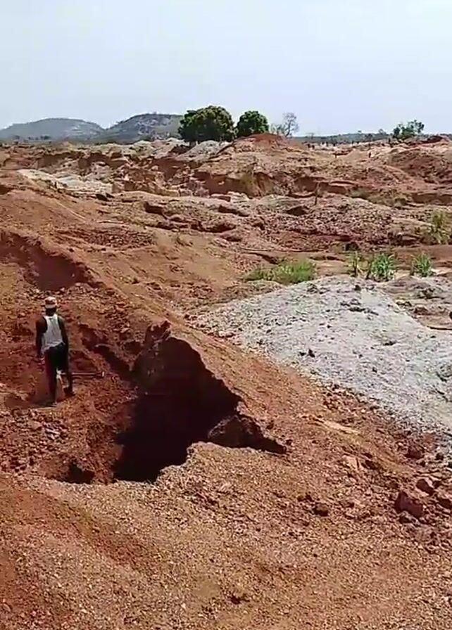 dry, uneven landscape with reddish-brown earth, marked by numerous pits and mounds. There are a few trees and low-lying hills in the distance under a partly cloudy sky. In the foreground, a large pile of light-grey gravel or crushed rock sits near a deep hole in the earth. As the video progresses, a man wearing dark clothing and a white hat walks towards and stands near one of the holes. Later, two other men walk across the landscape, carrying large sacks on their shoulders. The environment appears to be a mining or excavation site.