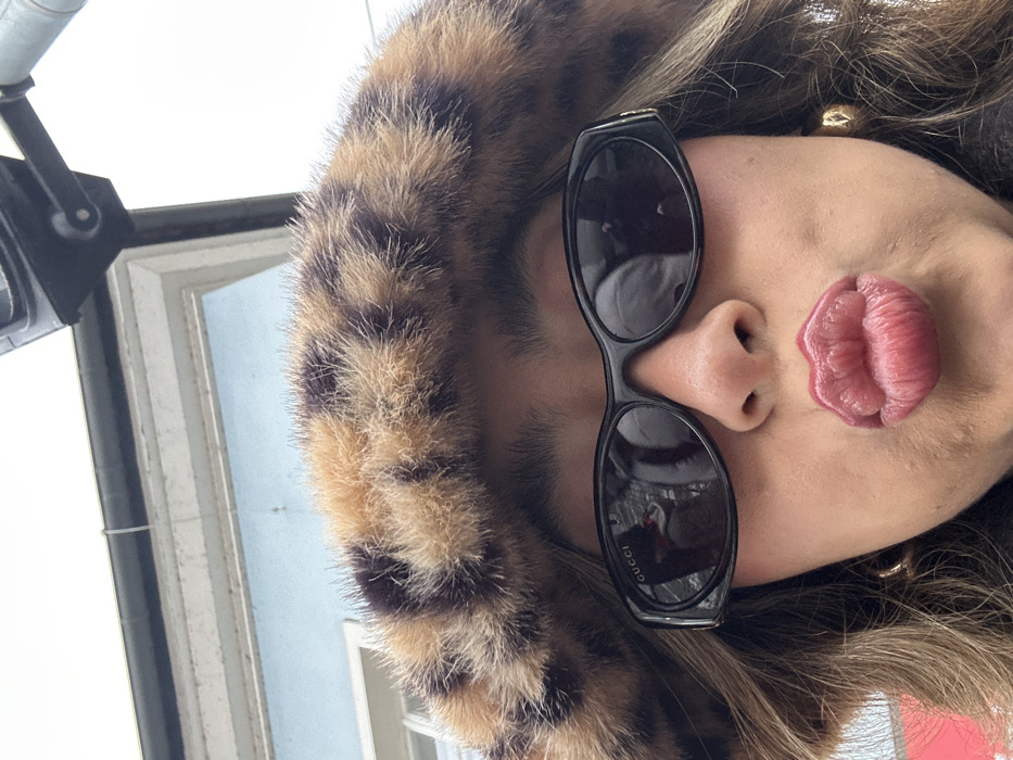 A close-up, low-angle portrait of an individual is depicted in an outdoor setting in Prague, Czechia. The subject is partially visible from the upper forehead to the chin, wearing a brown and tan leopard print faux fur hat or hood. Black, oval-shaped sunglasses, bearing the "GUCCI" brand name on the left temple, cover the eyes. The sunglasses' lenses reflect a blurred urban environment, including architectural elements and what appears to be an overhead wire or structure. The individual's mouth is pursed in a forward "kiss" pose, with glossy reddish-pink lips. Light brown or blonde highlighted hair is visible beneath the hat. A single gold-colored, spherical stud earring is present on the subject's right earlobe. The background directly above the subject's head features a light blue building facade, a white window frame, and a dark gutter system, under an overcast sky. A black mounting bracket or fixture is visible in the upper right corner of the frame.