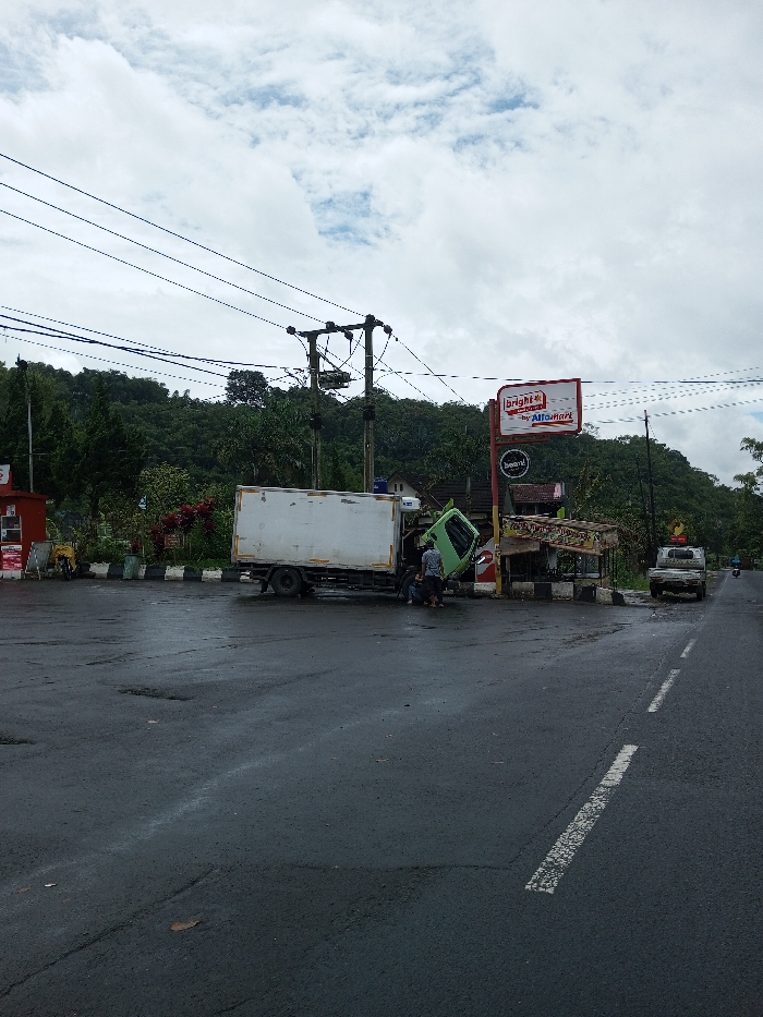The image displays a roadside accident scene under an overcast sky, with a wet asphalt road indicating recent precipitation. A white box truck with a light green cabin is stationary, having collided with a roadside structure on the right side of the road. The truck's cabin is significantly damaged, crumpled, and tilted upwards, suggesting a severe frontal impact. Two individuals are present near the front of the damaged truck, observing or attending to the vehicle. The structure impacted by the truck appears to be a small kiosk or building segment with wooden supports. Above this, a prominent red and white sign reads "Bright by Alfamart" with a "bean!" logo below it. In the background, lush green hills covered with trees are visible. Utility poles with multiple wires span across the upper portion of the frame. Further down the road to the right, a light-colored pickup truck is present, along with a distant motorcycle. On the far left, a red structure resembles a small service stand or gas pump. The presence of "Alfamart" branding indicates a location in Indonesia, which contradicts the specified "Serpang Shalli, Bhutan."