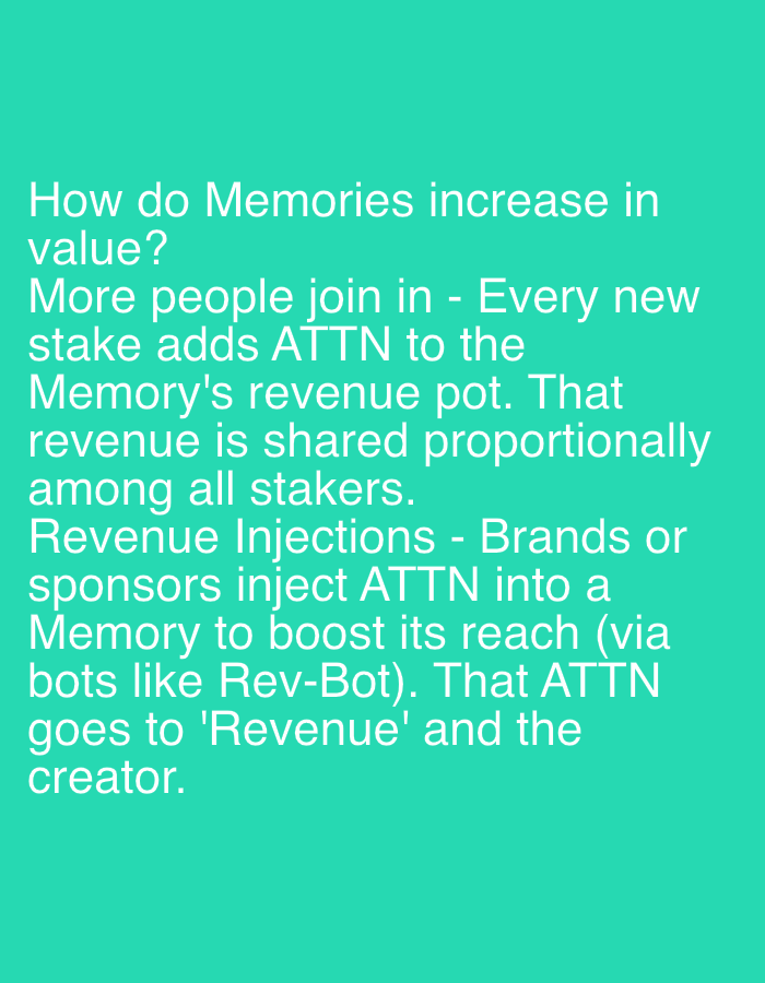 The text describes how Memories increase in value. It highlights two main mechanisms: more people joining, where each new stake adds ATTN to the Memory's revenue pot, which is then shared proportionally among all stakers. The other mechanism is revenue injections, where brands or sponsors inject ATTN into a Memory to boost its reach, using bots like Rev-Bot. This ATTN then goes to 'Revenue' and the creator.