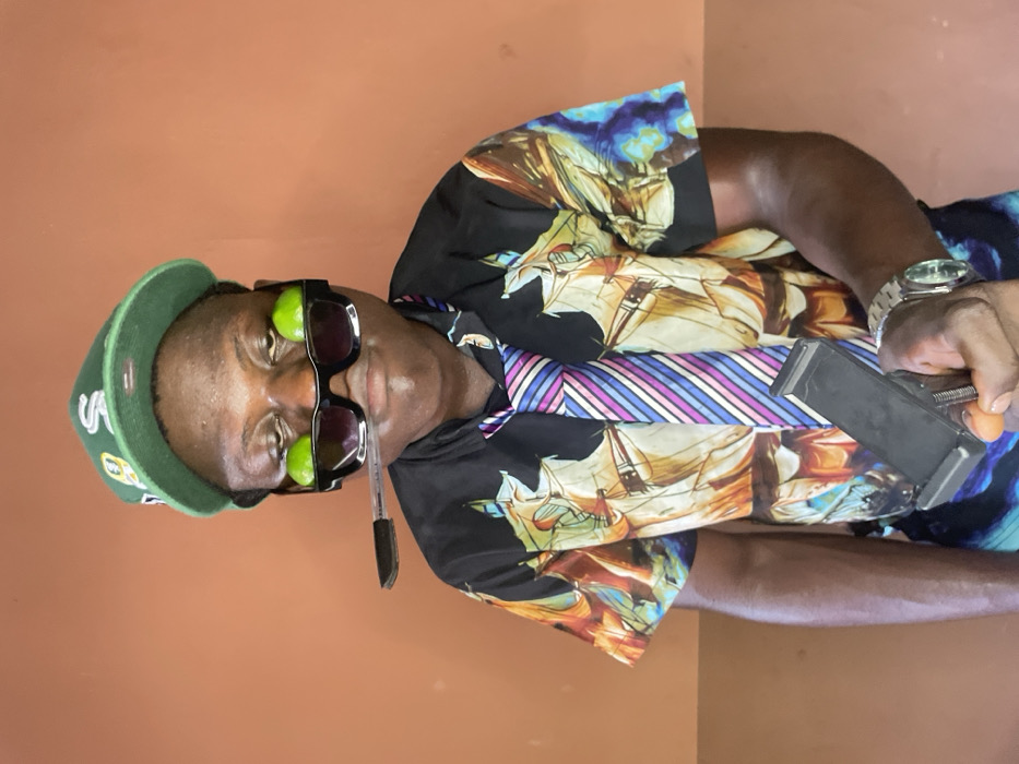 An adult male stands posing against a plain terracotta-colored wall in Mosafejaw, Nigeria. He wears a dark green baseball cap with a white "S" logo, dark sunglasses with a whole green lime resting on each lens, and a black ballpoint pen horizontally held by his upper lip. His attire consists of a short-sleeved, multi-colored patterned shirt, featuring abstract shapes resembling sailing vessels, worn with a striped necktie in shades of blue, purple, white, and pink. On his right wrist, he wears a silver-toned wristwatch. His right hand is extended forward, holding a black mobile phone holder or clamp. The individual looks directly towards the viewer with a neutral expression.