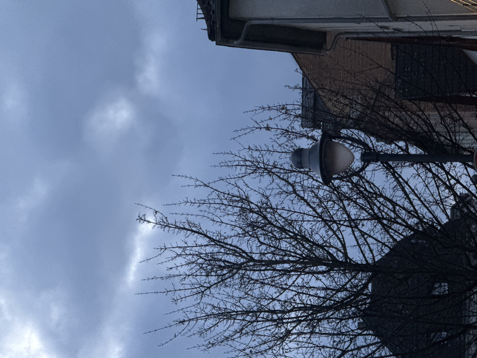 The image displays an urban scene in Bad Nauheim, Germany, under an overcast sky. The upper portion of the frame is dominated by a dense, uniform grey-blue cloud layer. A large deciduous tree with a network of bare, dark branches occupies the left and central foreground, silhouetted against the sky. A dark-colored street lamp with a traditional bell-shaped luminaire and a frosted white globe is positioned in the mid-right, partially obscured by the tree's branches. To the far right, the upper facade of a building with a light-colored wall, a dark tiled roof, and a prominent metal gutter system is visible. Additional building structures, including a reddish-brown brick facade and dark pitched roofs, are discernible through the tree canopy in the background. No individuals or discernible activities are present in the frame.