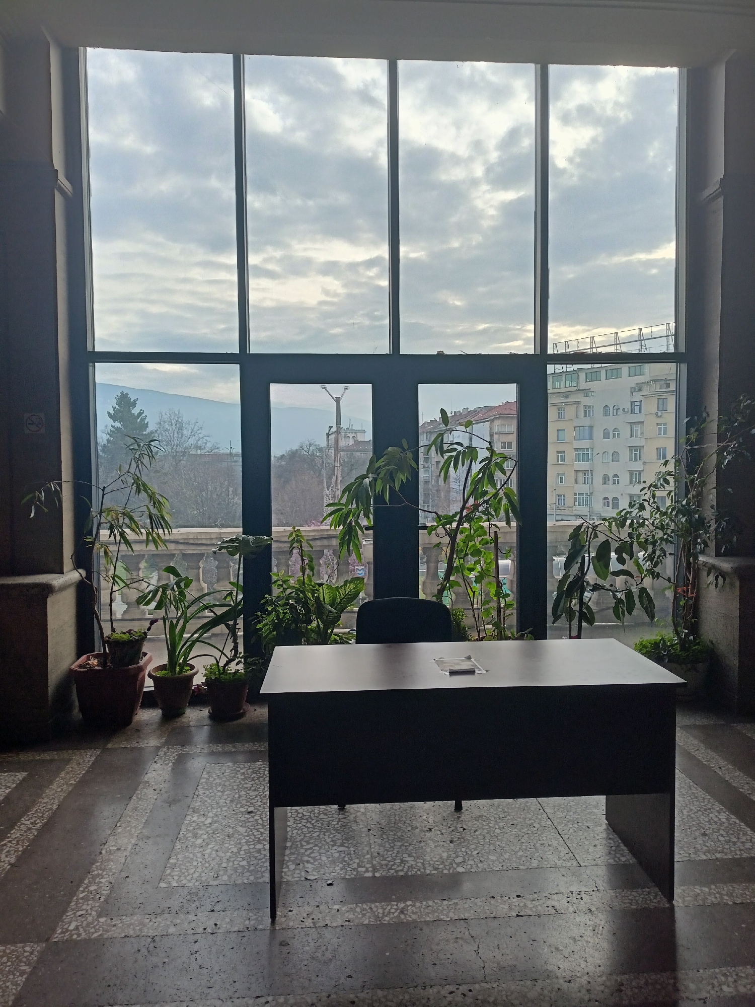 The image depicts an indoor scene with a large window overlooking a cityscape. The window is divided into multiple panes and framed in dark metal. Outside, the sky is overcast with gray clouds. Buildings of varying heights and architectural styles are visible, including one with a pale facade and numerous windows, possibly apartments or offices. The window also offers a partial view of a distant mountain range. Inside, a dark-colored desk stands in the foreground, positioned in front of the window. A chair is behind the desk. A few pieces of paper or cards are resting on the desk's surface. Potted plants are arranged along the interior windowsill. The interior appears to be a foyer or a large room in a public building, evidenced by the patterned tile floor and architectural details on the walls, including columns. The light is subdued, creating a muted color palette. The location is Sofia, Bulgaria, based on the architecture, and cityscape view.